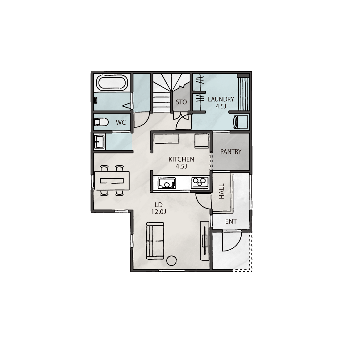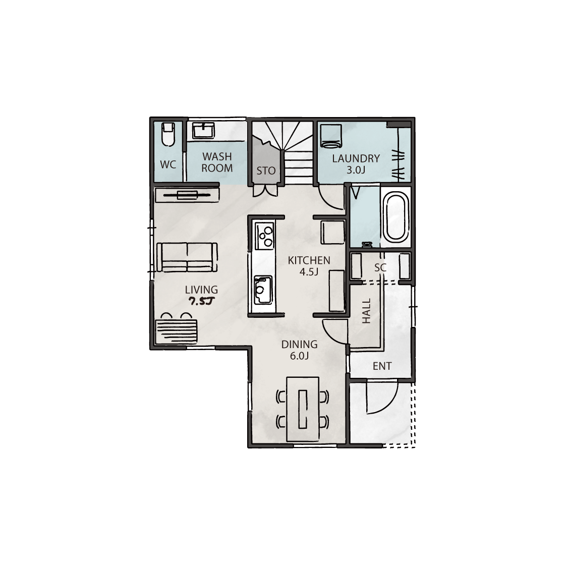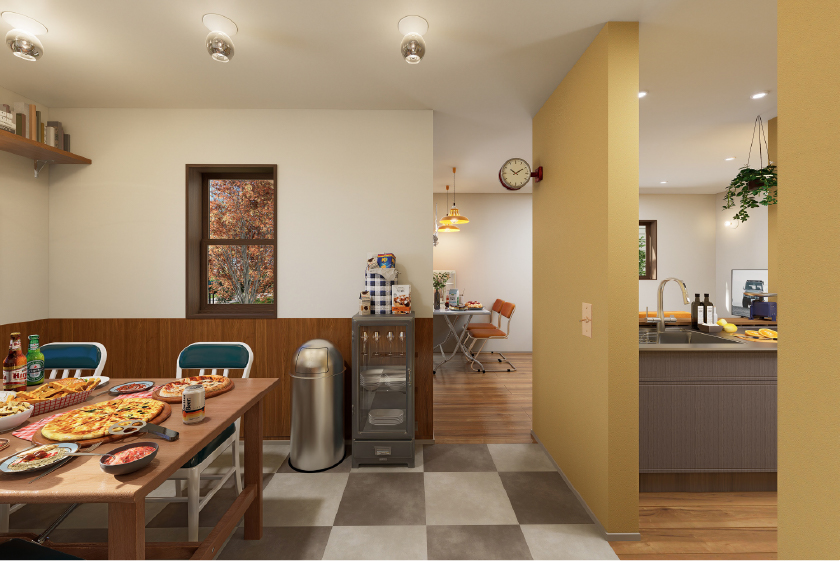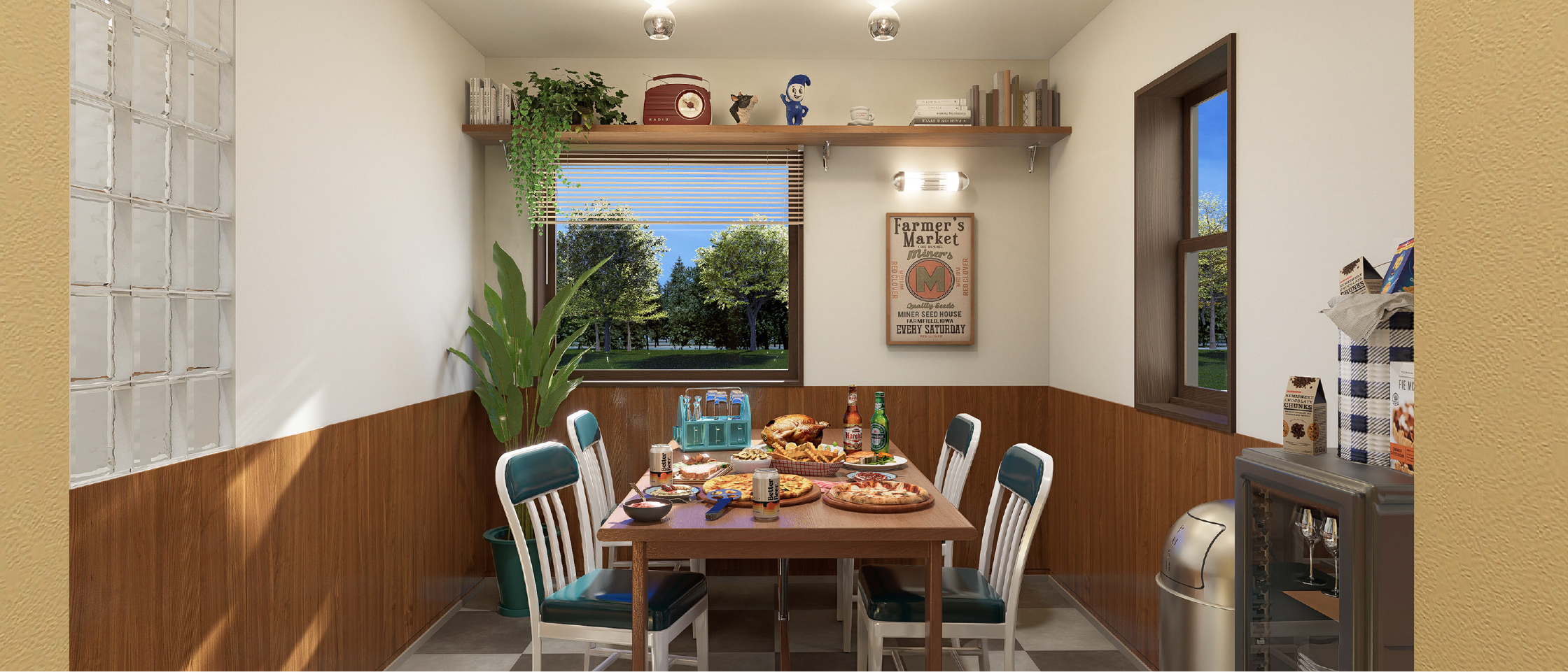 家族や仲間と過ごす食事の時間をより豊かに彩るダイニング。床のアクセントやオリジナルウッドパネルで仕上げた腰壁。外観の象徴となるFIX窓。ポイントで入れたアクリルブロックが、海外のダイナーを彷彿とさせる。ディスプレイを楽しめるウォールシェルフで、自由に表現することができ、ノスタルジックな雰囲気の中にダルトンホームらしい遊び心を散りばめました。
