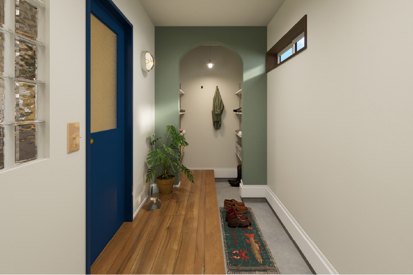 扉を開けると、落ち着いたオリジナルグリーンのアーチがそっと迎える奥行きあるエントランス。SCへと続くアーチは、控えめながら個性を演出。