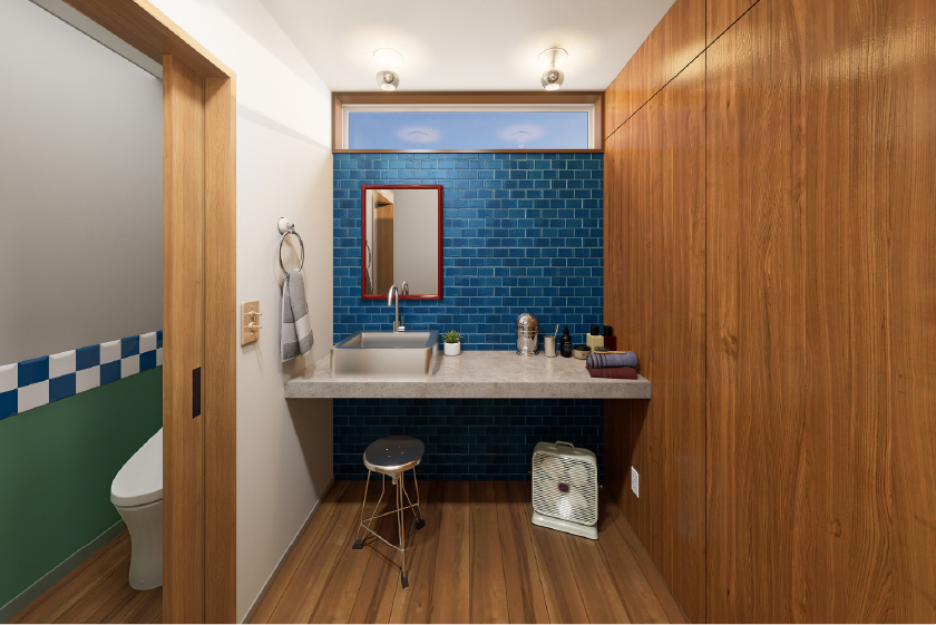 ネイビーのアクセントとダルトンのアイテムで仕上げた造作洗面は、クラシカルな雰囲気を纏い、落ち着いたトーンで上質感を演出。リビングからの視線も考慮したレイアウトと、洗練された素材の組み合わせで、日常の身支度が心地よいひとときに変わります。