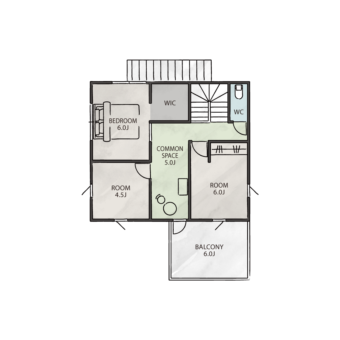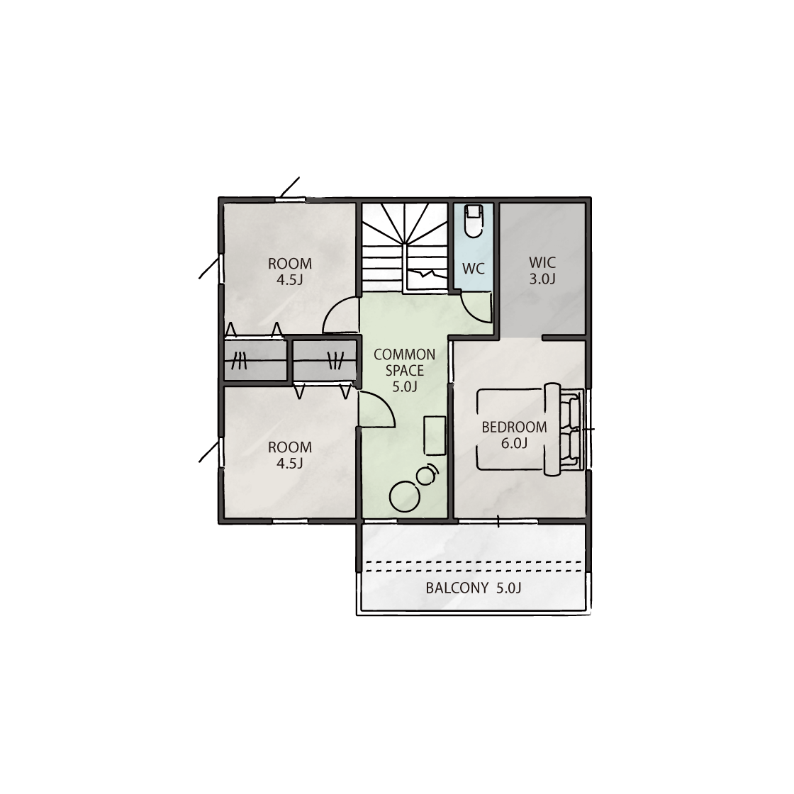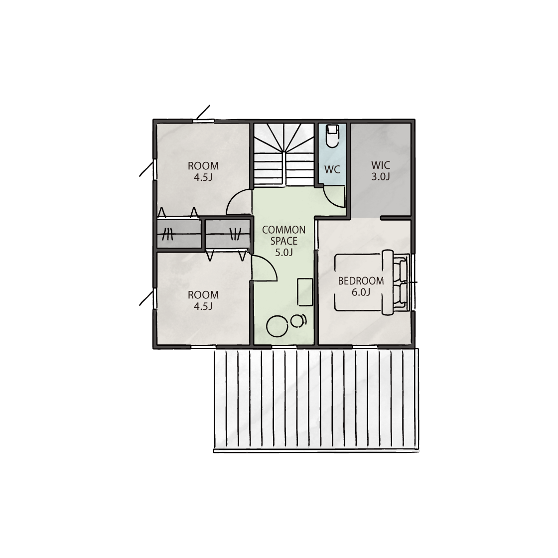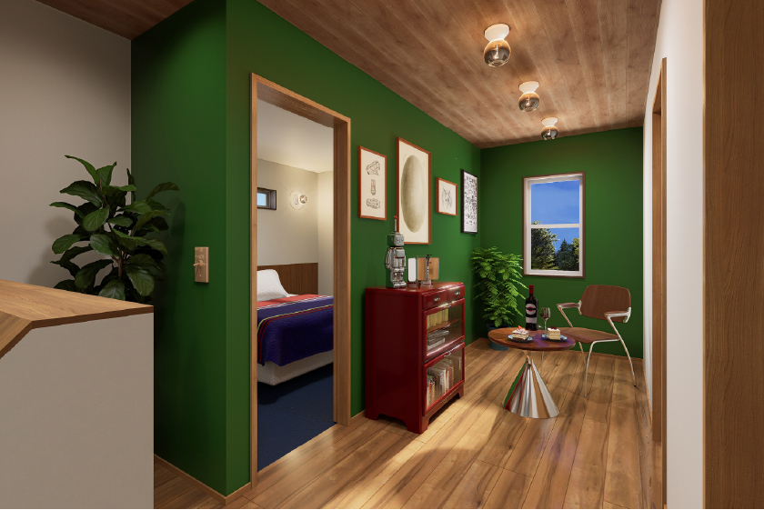 家族が思い想いに過ごす共有空間。個室ほどのプライベート感はないけれど、オープンすぎず、居心地の良さを保ちます。第二のリビングとして、一人で映画を観たり、身支度をしたり。時には夜中のスイーツやブランチを楽しむ食事の場にもなり、暮らしに柔らかい時間を添える、家族のための自由なスペースです。ショップのように好きな服を並べ、眺めるひとときを楽しむ、オープンディスプレイの空間としても活用できます。