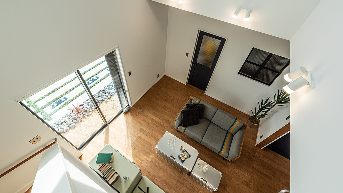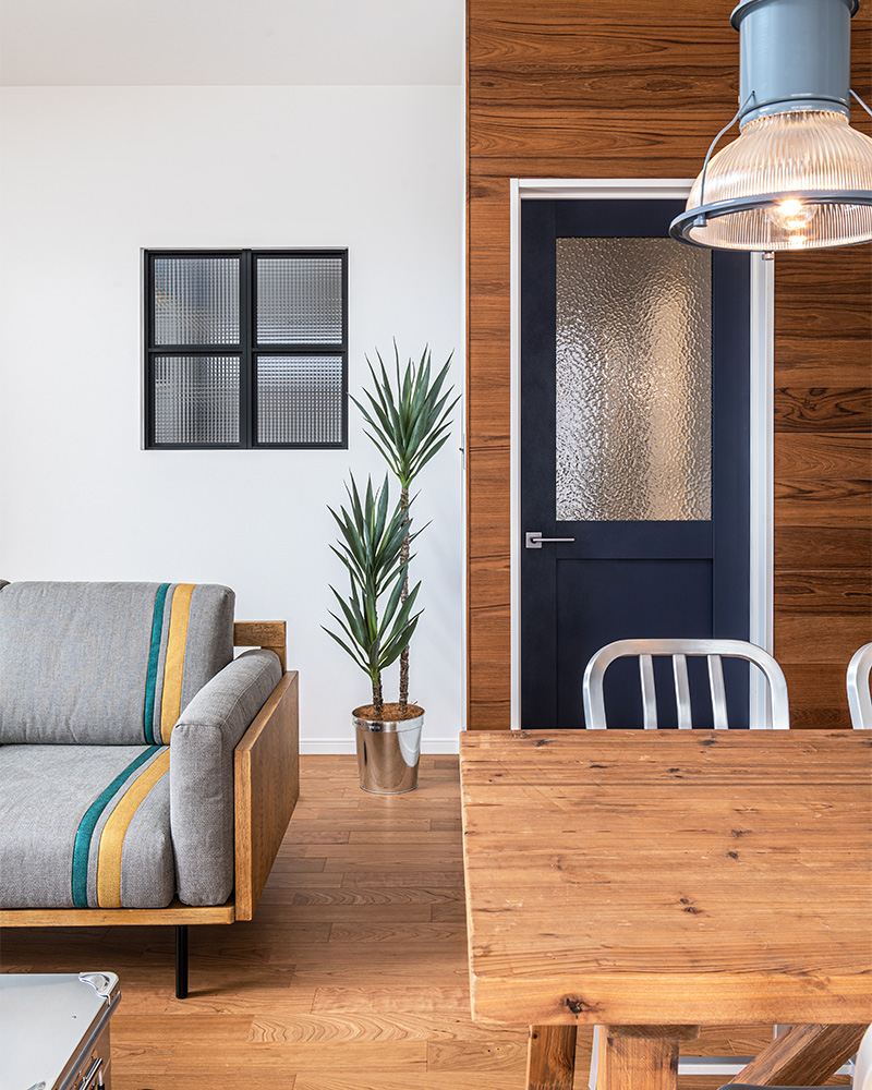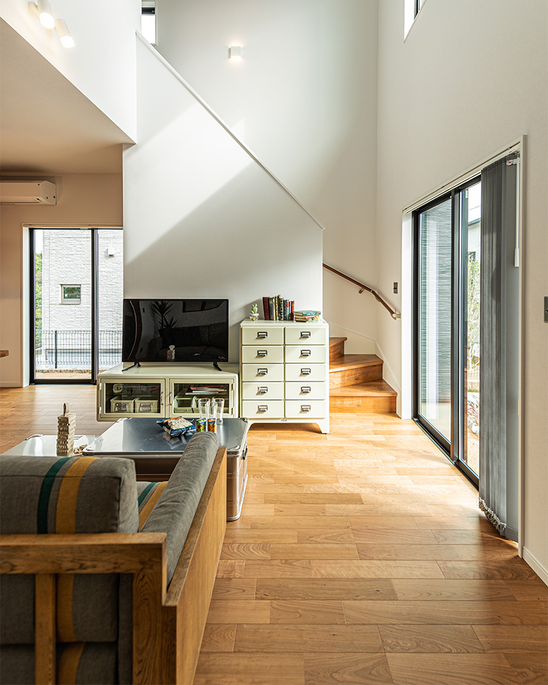 ガラス入りのドアや室内窓、吹き抜けのFIX窓から降り注ぐ光が、空間を軽やかでまろやかに。