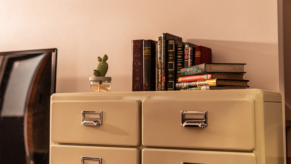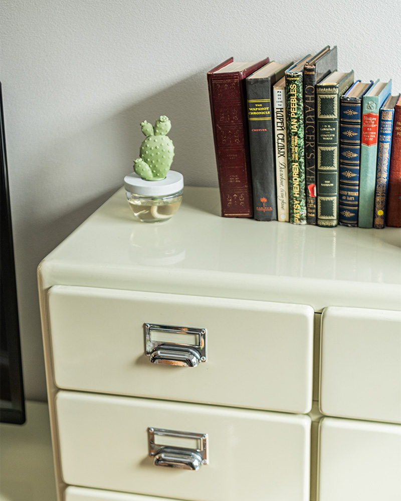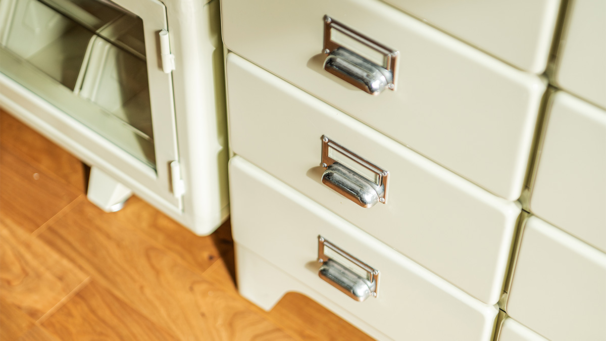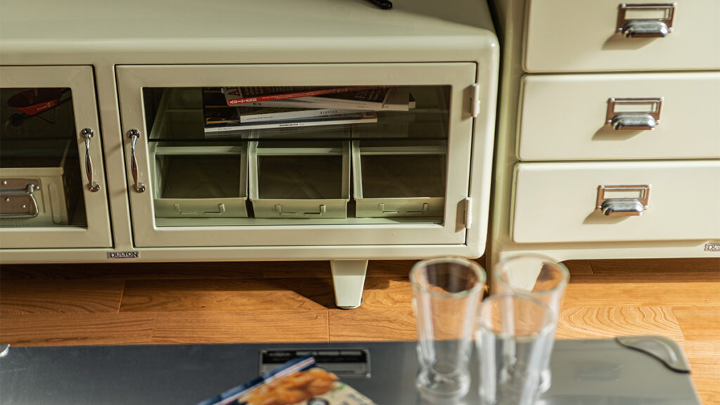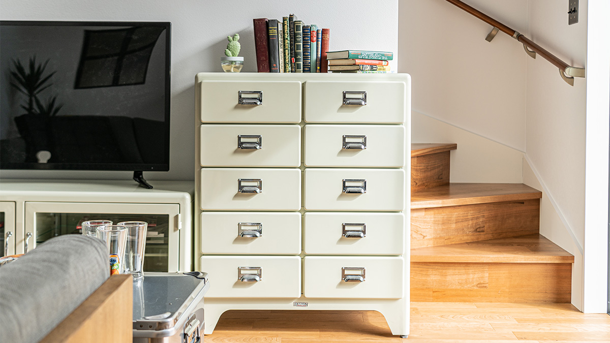 スチール家具と聞くと少しハードルを感じる方もいますが、アイボリーカラーなら親しみやすく、空間のスパイスとして存在感を放ちます。
