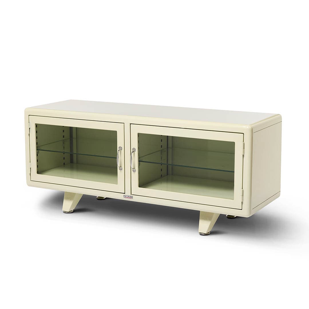 スチールならではの重厚感を残しつつも、脚パーツやガラス扉、スマートな取っ手など細部のディテールで軽やかさを演出し、