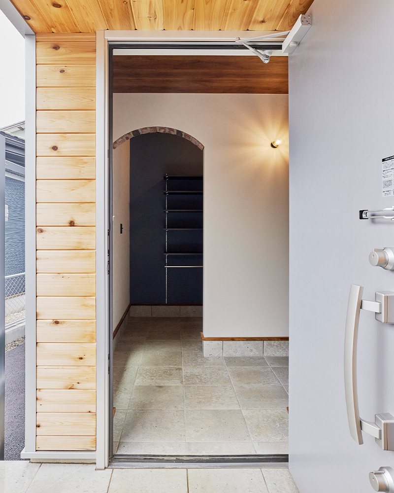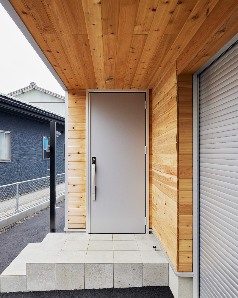 玄関の軒天とガレージの入隅にはウッドを採用。