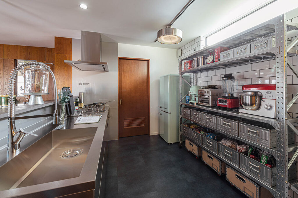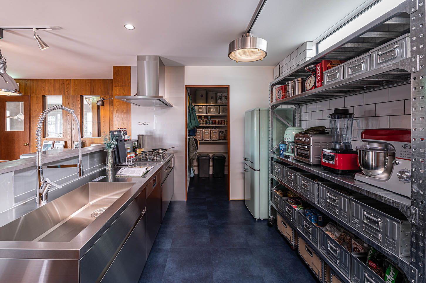 キッチンは、ブルーのフロアタイルにステンレスのキッチン、ホワイトのサブウェイタイルを組み合わせた、カフェの厨房のようなインダストリアルな空間。