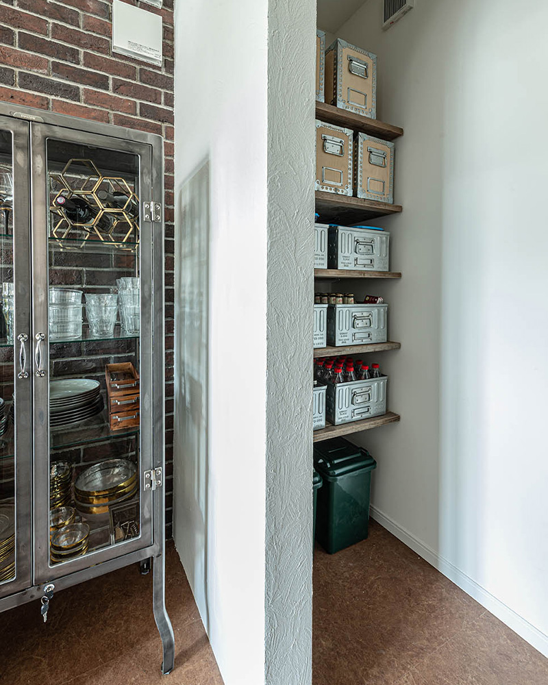 奥に続くパントリーには、ダルトンの店舗什器であるスチールシェルフを採用。