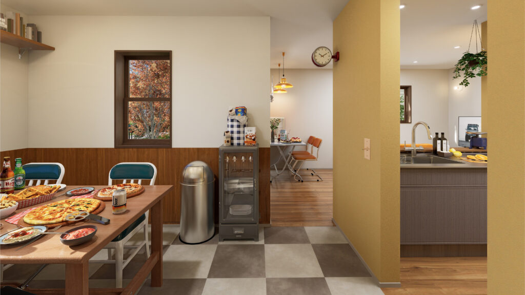 家族の暮らしを中心に考えた間取りは、南面に配したダイニングが個室的な落ち着きを演出し、毎日の食事シーンを心地よく彩ります。