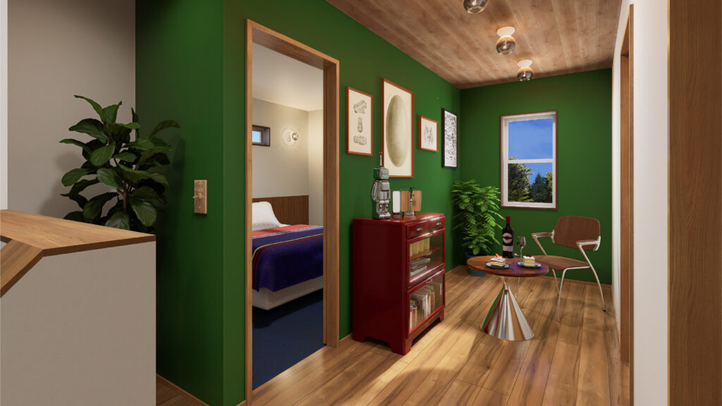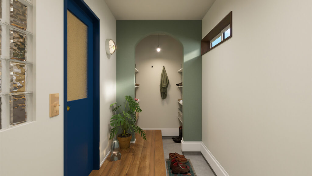 扉を開けると、落ち着いたオリジナルグリーンのアーチがそっと迎える奥行きあるエントランス。SICへと続くアーチは、控えめながら個性を演出。